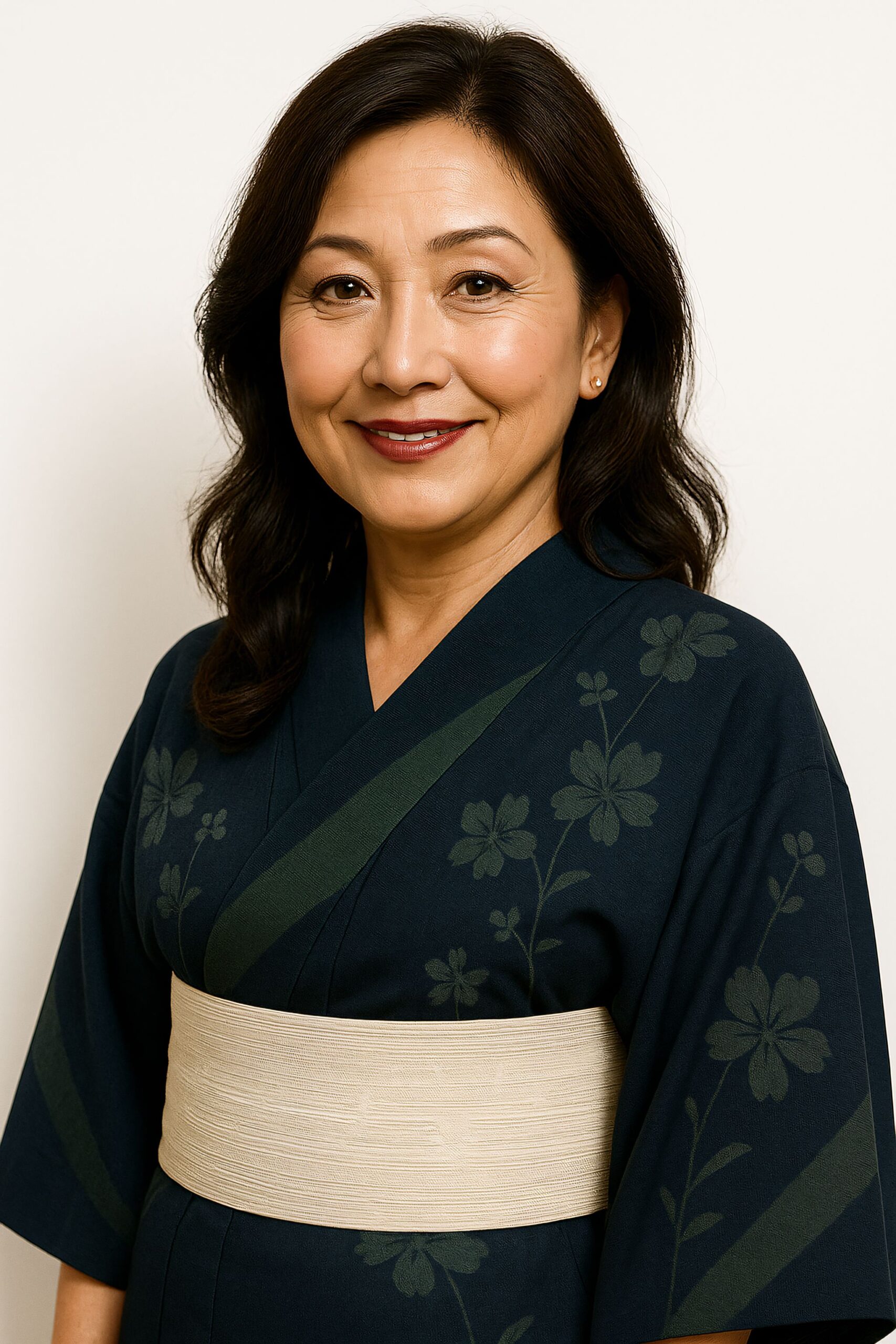 The patterns of her yukata sway gently, glowing in the sunset light.