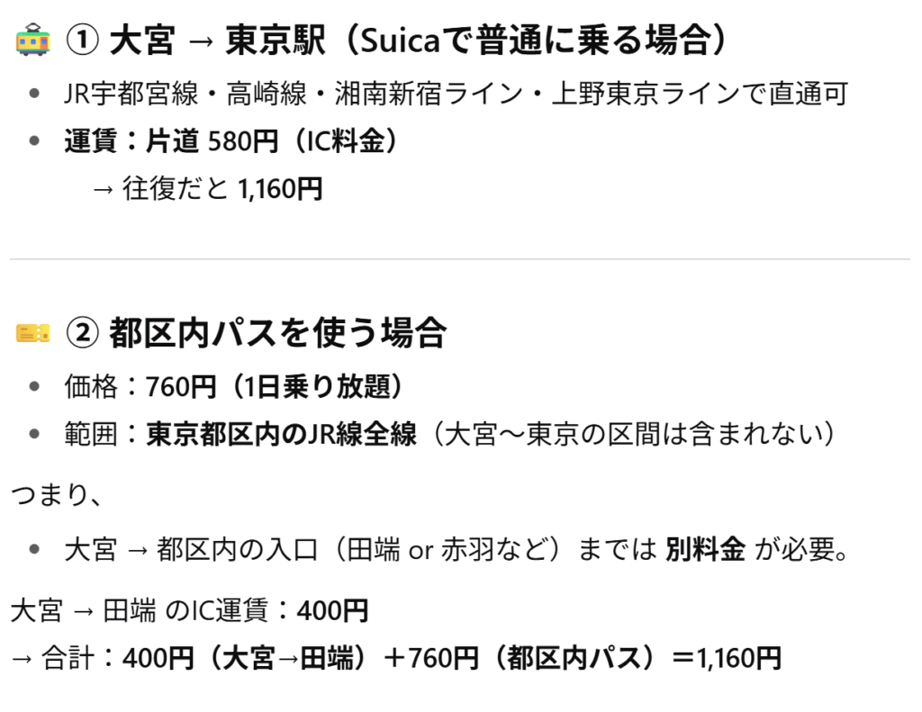 大宮ー東京駅 普通にSuicaで使うのと都区内パスを利用するのどっちがお得か