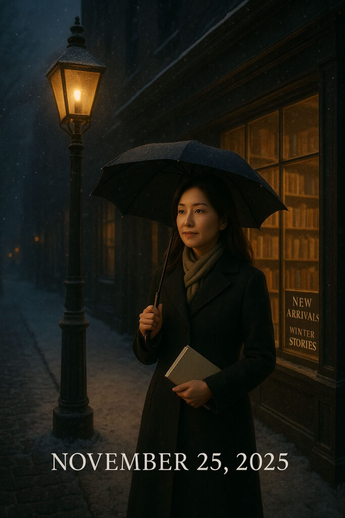 Marian closed her umbrella and stood beneath the awning, looking at the narrow street that led away from the station. The lamps were on early. Across the road, the bookshop’s window glowed with a soft, honeyed light. A sign read “New arrivals — winter stories.”